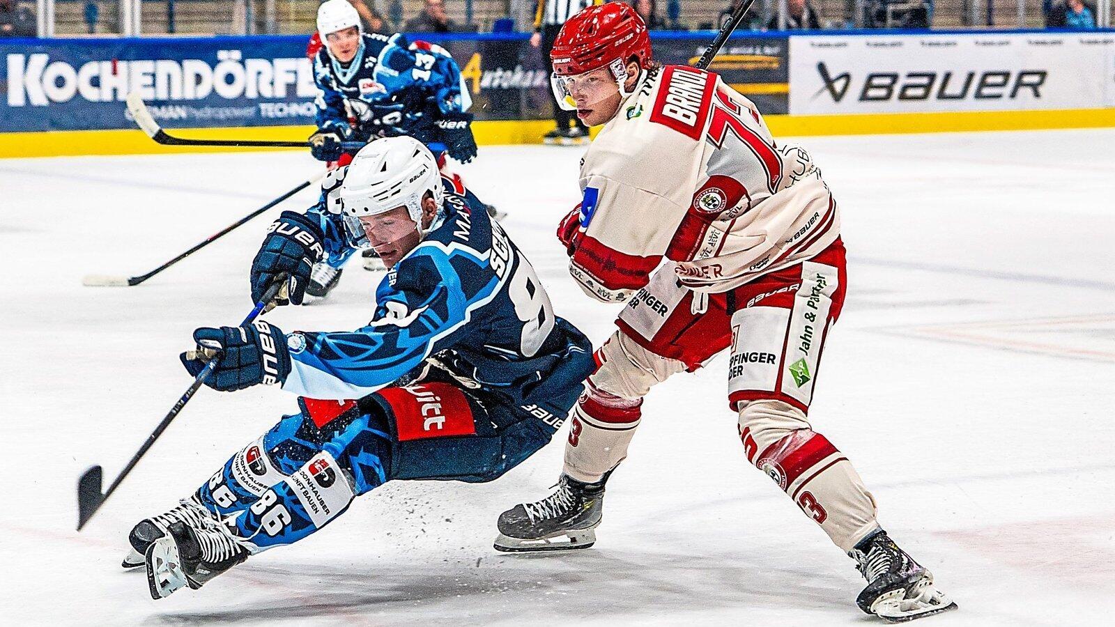 Obenauf: Die Landshuter verpassten den Blue Devils Weiden - hier Tom Schwarz - eine Heimschlappe. Mit zwei Torvorlagen steuerte auch Linus Brandl (rechts) sein Scherflein dazu bei.