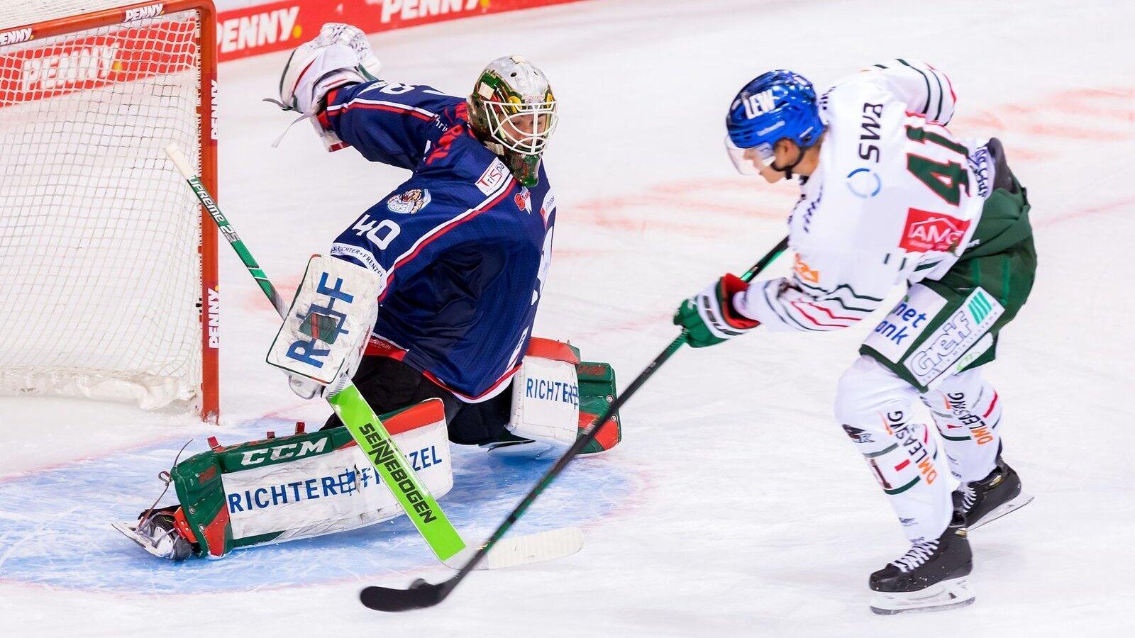 12. Minute: Was für eine Chance für die Gäste! Eisenmenger gewinnt das Duell mit Kohl, läuft alleine auf Robson zu, doch der Tigers-Goalie packt einen ganz starken Save aus.