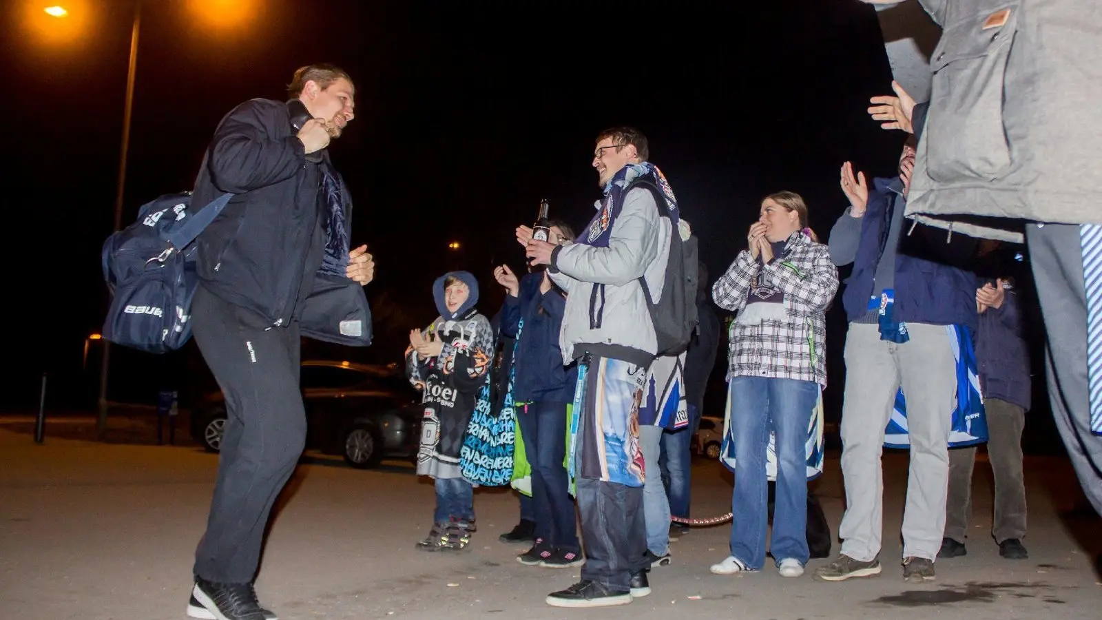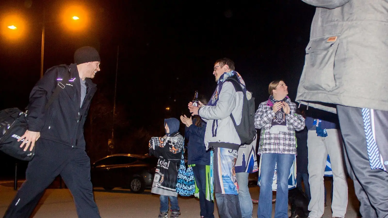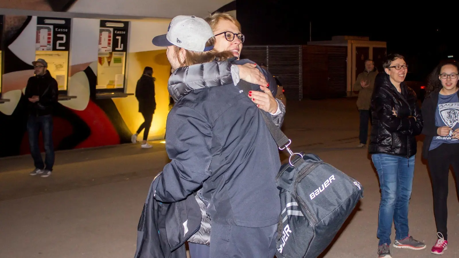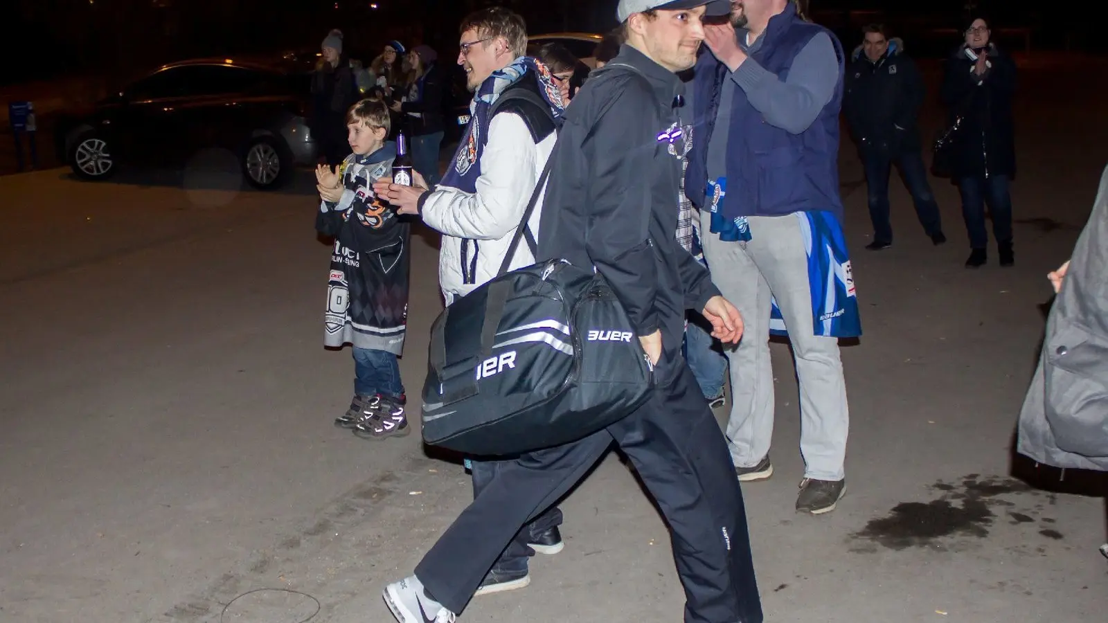 Am Sonntagabend gab es bereits die ersten Playoff-Tickets zu erwerben, ab 20.30 Uhr hatten die Ticketschalter am Eisstadion geöffnet. Der Andrang hielt sich dabei aber (noch) sehr in Grenzen. Somit waren es auch nur rund 30 Fans, die um 21 Uhr die Mannschaft in Empfang nahmen. Auf dem Weg vom Bus ins Eisstadion wurden die Spieler von Applaus begleitet und von Geschäftsführerin Gaby Sennebogen umarmt. Die Spieler brachten ihre Taschen in die Kabine und machten sich dann auf den Heimweg. Als die ersten Fanbusse ankamen, waren die meisten Akteure bereits wieder weg.