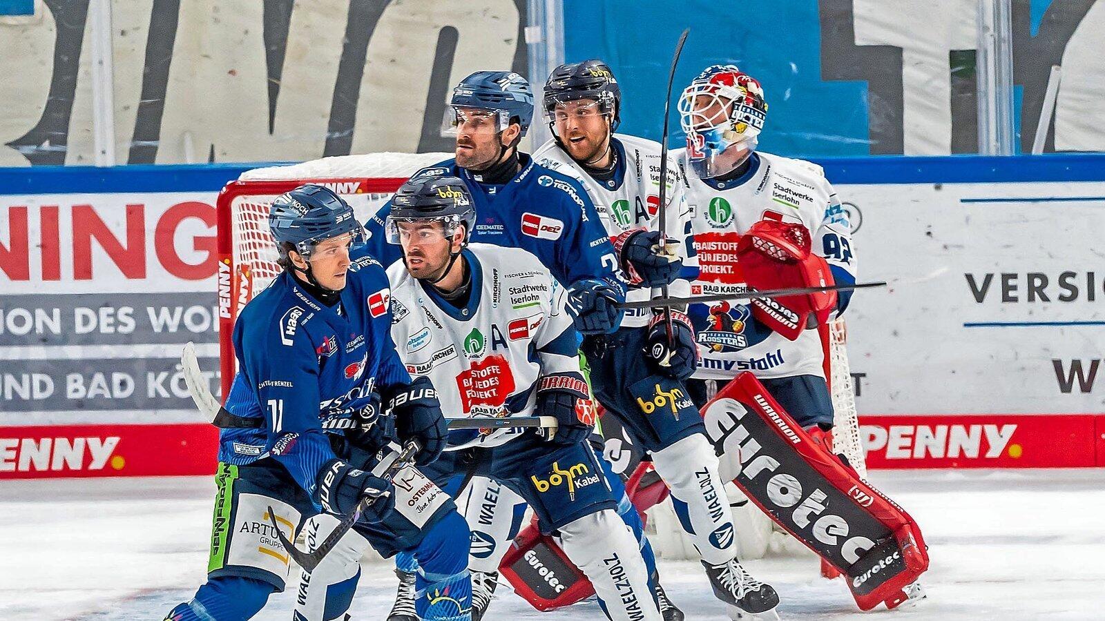 Um gegen die defensivstarken Iserlohn Roosters zum Torerfolg zu kommen, mussten Nick Halloran und Justin Scott vor dem Gehäuse von Andreas Jenike am Freitagabend Schwerstarbeit verrichten.