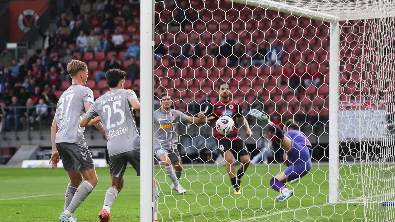 Das Tor, das die Jahn-Niederlage besiegt: Die Regensburger Leopold Wurm und Nicolas Oliveira (von links) sowie Torwart Felix Gebhardt müssen mitansehen, wie der Ball von Tim Kloss (nicht im Bild) einschlägt.