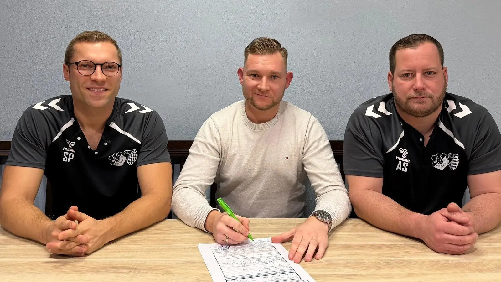 Stefan Pleintinger (l.) und Sven Arendt (r.) von der SG Dornach/Roßbach freuen sich, dass sich Andre Vogel (Mitte) für ein Engagement als Trainer bei der Spielgemeinschaft entschlossen hat.