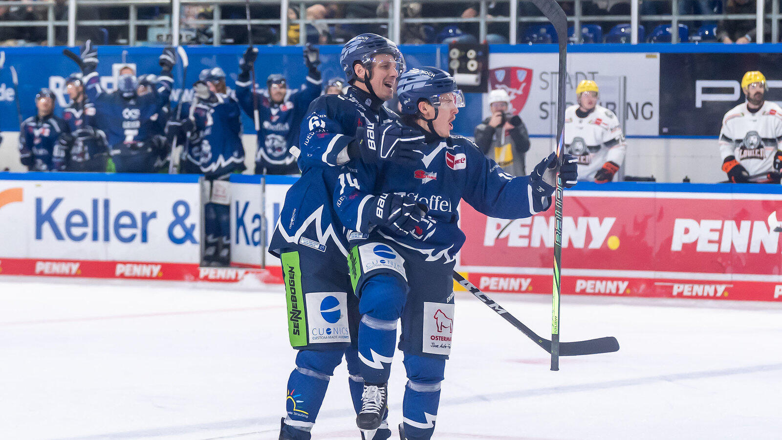 So kann man sich schon mal zurückmelden: Travis St. Denis (r.) sorgt bei seiner Rückkehr nach einer Fünf-Spiele-Sperre für den Siegtreffer gegen Frankfurt. Auch Justin Braun, der hier gratuliert, wurde zuletzt schmerzlich vermisst.