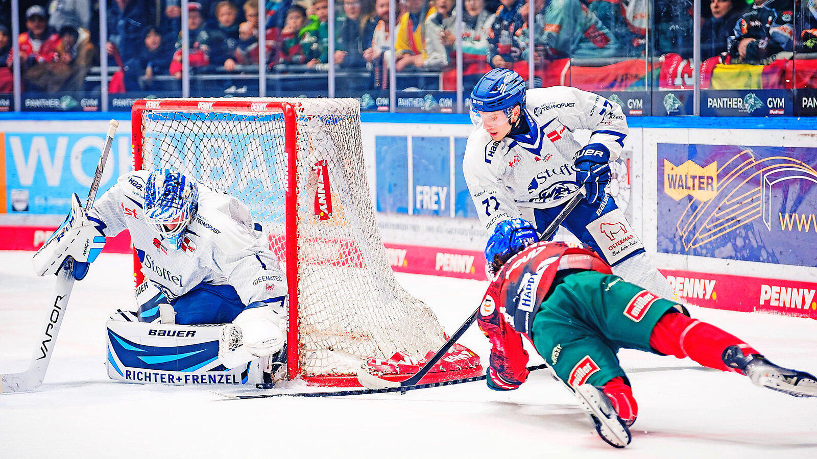 Florian Bugl im Straubinger Tor hält am Freitagabend in Augsburg, was es zu halten gibt, im Verbund mit Nelson Nogier (hinten) auch diesen Schuss des tief fliegenden Panther-Stürmers Anthony Louis. Weil die eigenen Angreifer aber wieder reihenweise Chancen vergeben und sich die komplette Mannschaft - mit Ausnahme von Bugl - zu viele Fehler leistet, verlieren die Tigers am Ende trotzdem verdientermaßen mit 1:4.