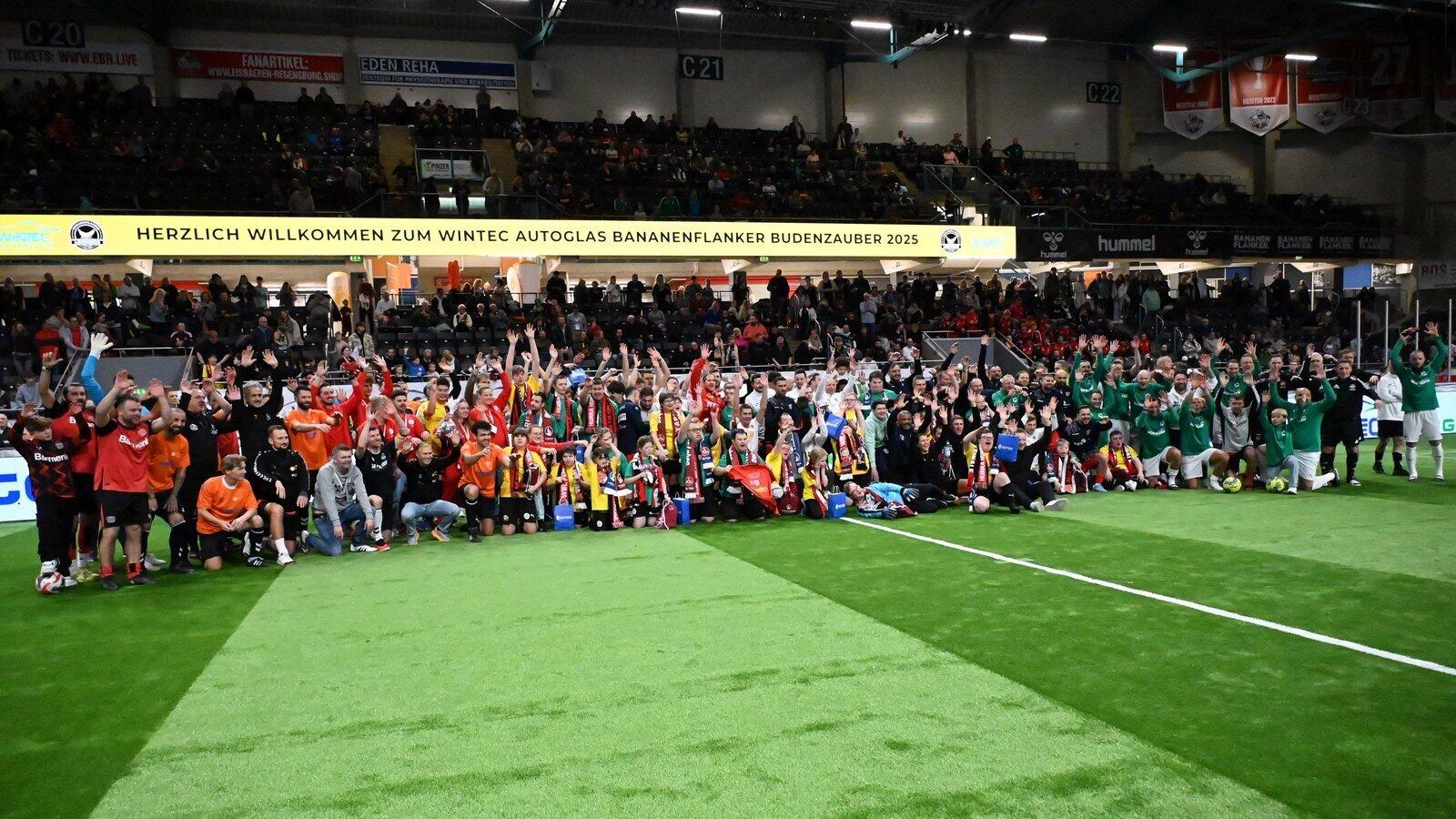 Gruppenbild mit Kids und Profis: Auch der 6. Bananenflanken-Budenzauber in der Donau-Arena verspricht eine prächtige Atmosphäre.