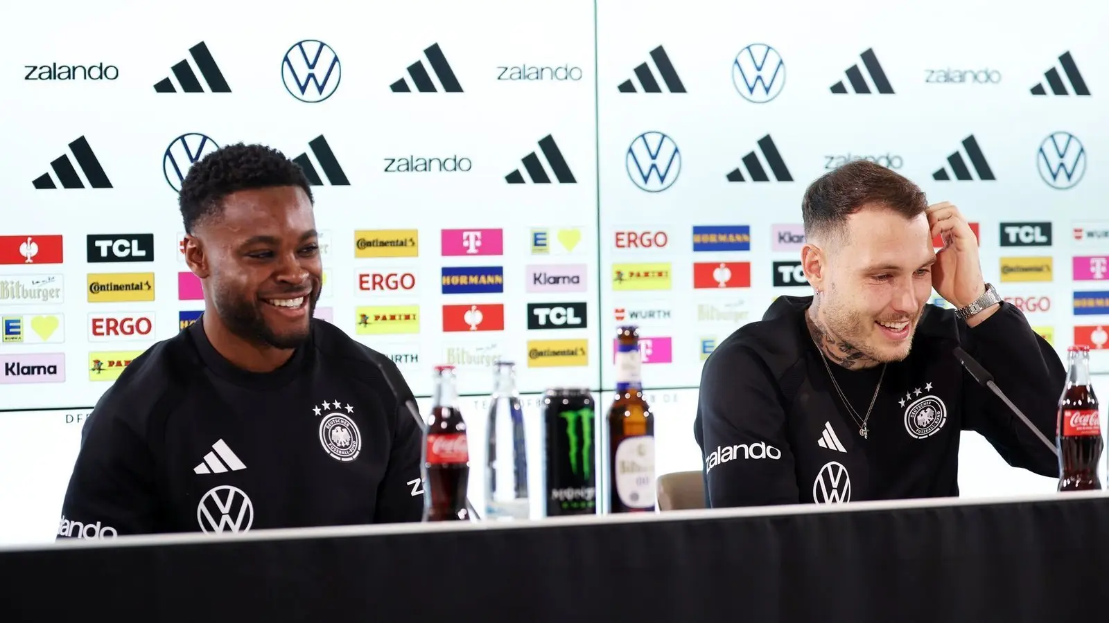 Ridle Baku (l.) und David Raum (r.) sprechen bei der DFB-Pressekonferenz über ihre Rollen.