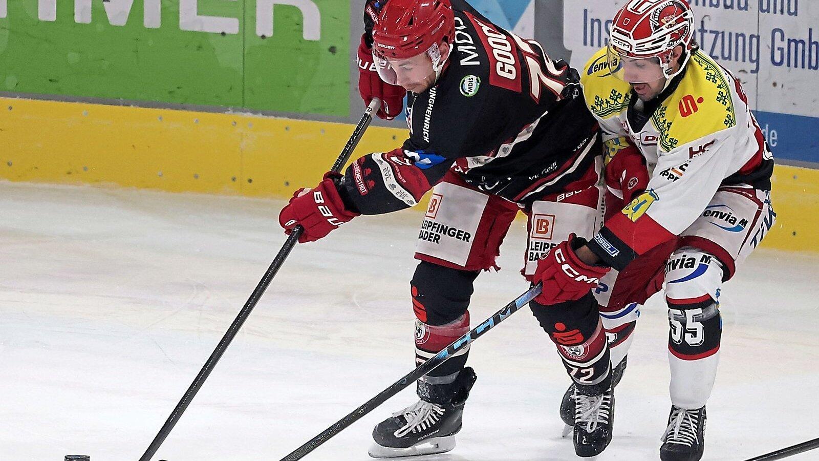 Kein Durchkommen: Der EV Landshut um Stürmer Trevor Gooch (links) fand am Freitagabend gegen Crimmitschau einfach kein Mittel und blieb vorne meist viel zu ungefährlich.