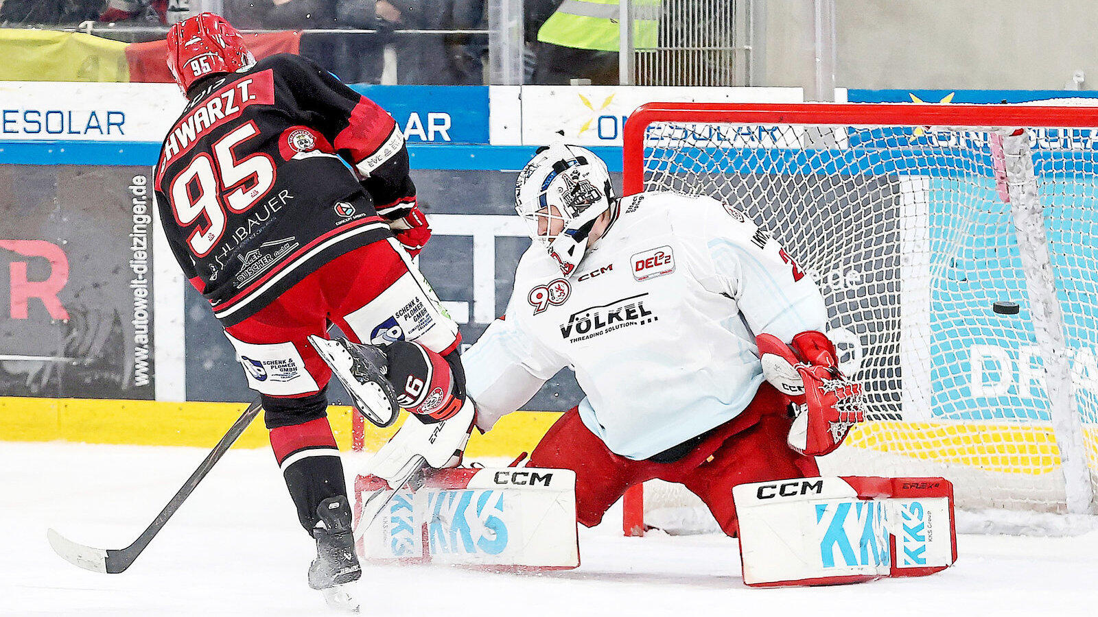 Goldener Treffer: EVL-Stürmer Tobi Schwarz (links) war im Penaltyschießen als einziger Schütze erfolgreich - und sicherte seinen Farben damit den wichtigen Sieg und die zwei Punkte.