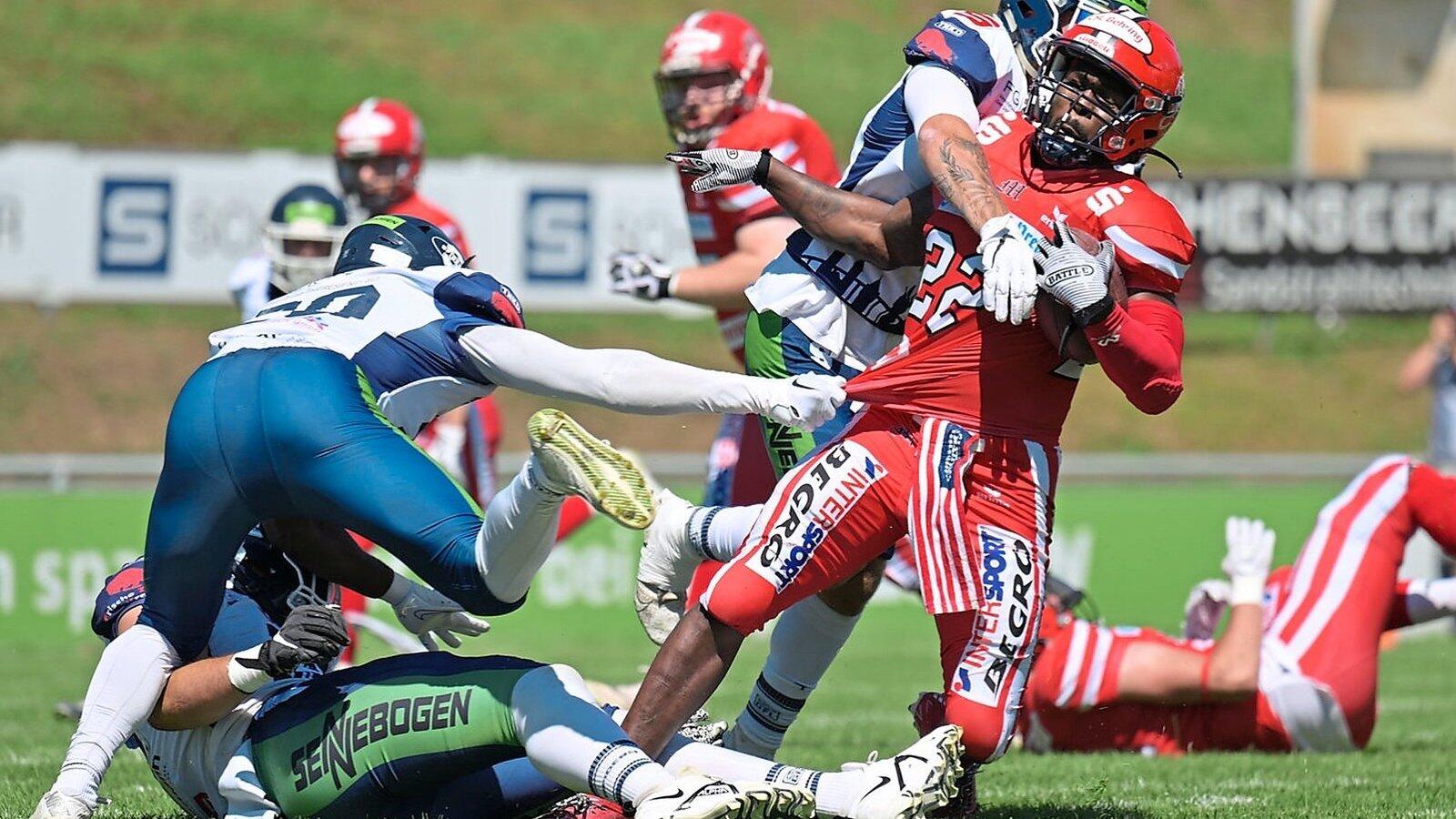 Die Verteidigung der Straubing Spiders, hier gegen die Marburg Mercenaries, wird gegen Ravensburg vor allem in der zweiten Hälfte ordentlich zupacken müssen, um den nächsten Sieg einzufahren.