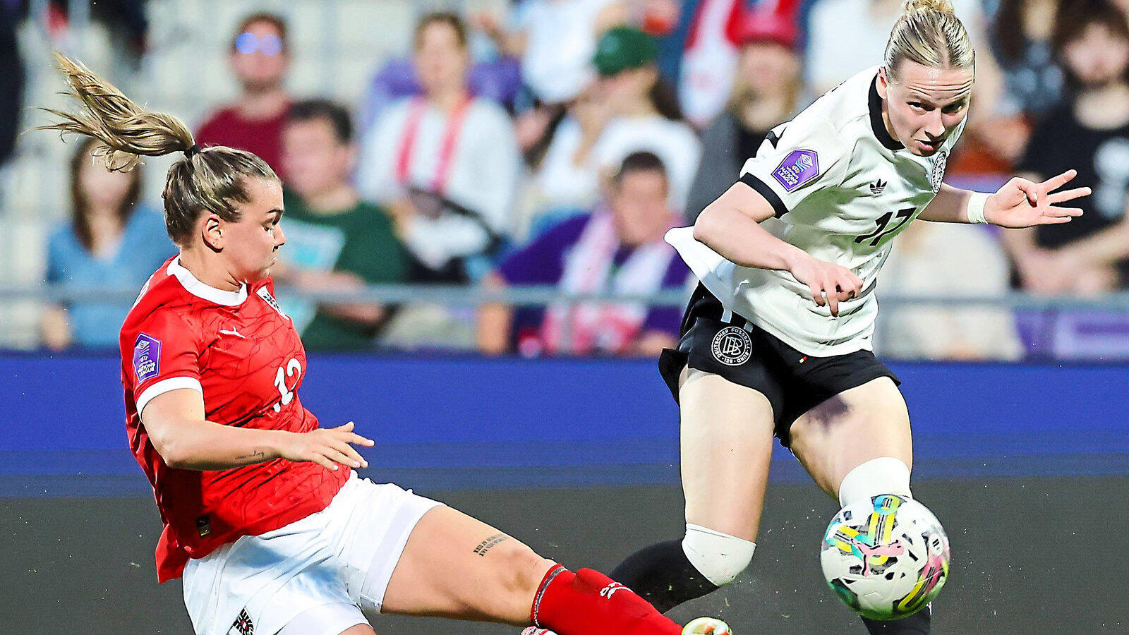 „Meine Stärke liegt definitiv in meiner Schnelligkeit und Explosivität“, sagt Franziska Kett - hier im Duell mit Österreichs Laura Wienroither (links) - über ihr Spiel.