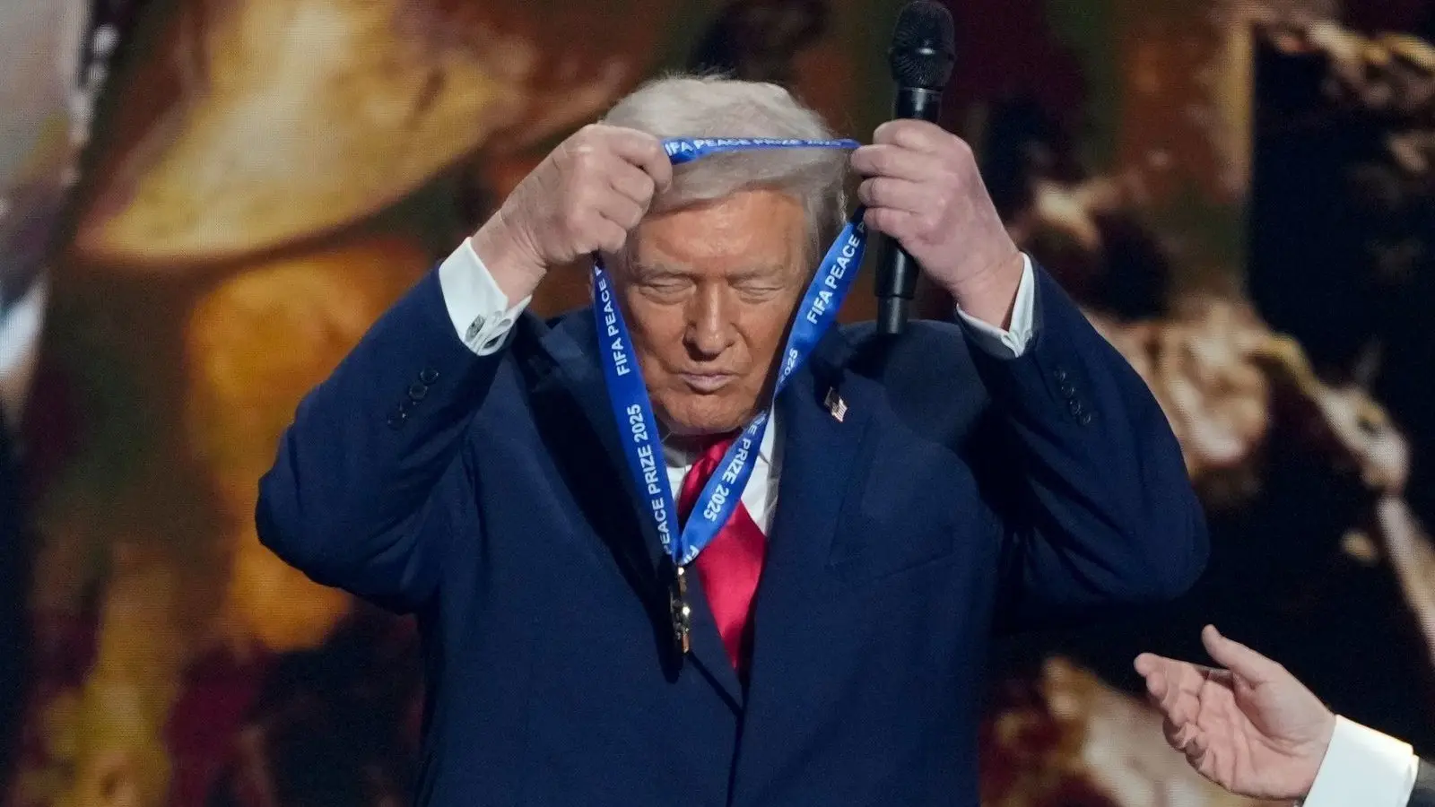 Bei Trumps Auftritt auf dem WM-Event in der Kultureinrichtung Kennedy Center in der US-Hauptstadt Washington stach ein Moment besonders hervor: Er legte sich auf der Bühne eine Medaille, die ihm überreicht wurde, direkt selbst um den Hals.
