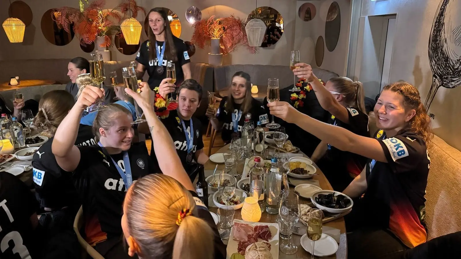 Als der DHB-Bus um 22.05 Uhr vor das Restaurant in der Rotterdamer Innenstadt rollte, dröhnten aus dem Inneren schon die altbekannten Schlager. Mit Deutschlandfahnen und WM-Brillen tanzten die WM-Handballerinnen nach ihrem Silber-Coup in den Partyraum. Beim Sekt-Empfang war die unnötige Final-Niederlage gegen Norwegen längst vergessen. „Open Bar mit Open End“, hatte Teammanagerin Anja Althaus noch während des Spiels als Motto der Nacht ausgerufen und so den Startschuss für die Feier bis in die Morgenstunden gegeben.