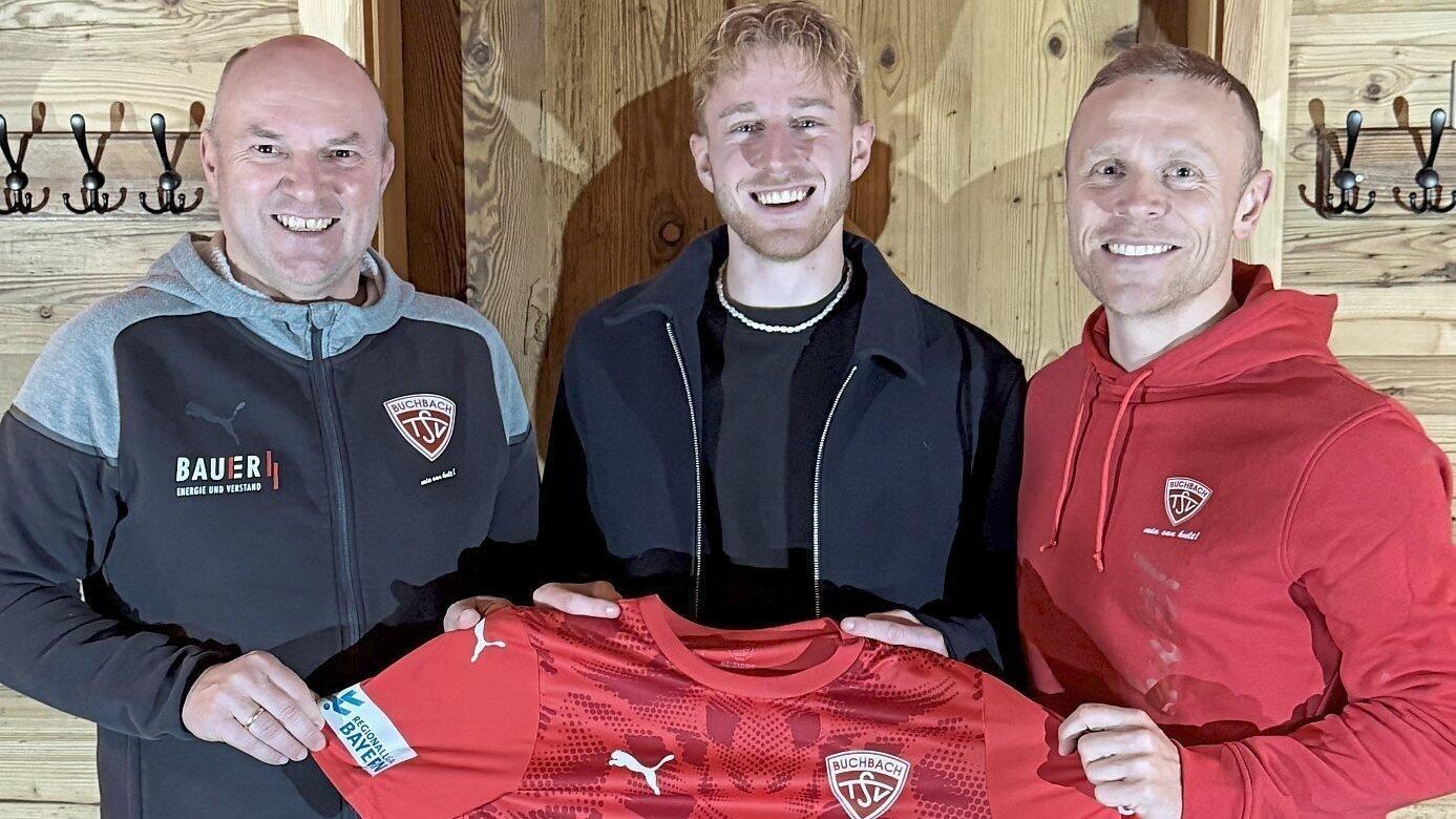 Zurück in Buchbach: Abteilungsleiter Georg Hanslmaier (li.) und Sportleiter Andreas Bichlmaier (re.) freuen sich, dass Jonas Wieselsberger nach seinem Portugal-Abenteuer wieder das Leiberl der Rot-Weißen überstreift.