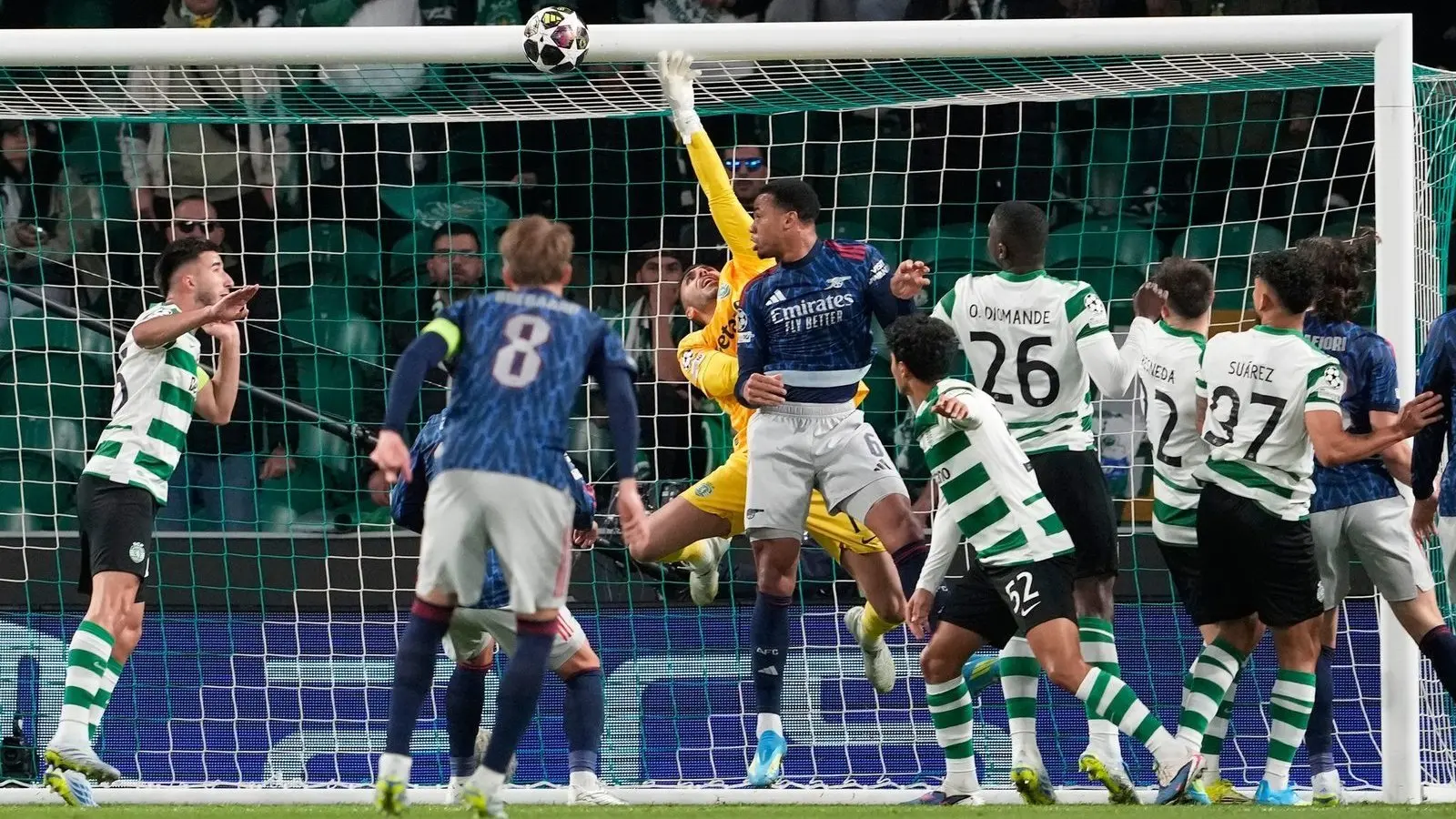 Im Regen von Lissabon wurden die auf Ballkontrolle fokussierten Gunners vom portugiesischen Double-Sieger zu Beginn mächtig unter Druck gesetzt. Das führte bereits in der 6. Minute zur ersten richtig dicken Möglichkeit durch Linksverteidiger Maxi Araújo, der bei seinem wuchtigen Abschluss von der Strafraumkante die Latte traf. Arsenals Keeper David Raya war noch mit den Fingerspitzen dran.