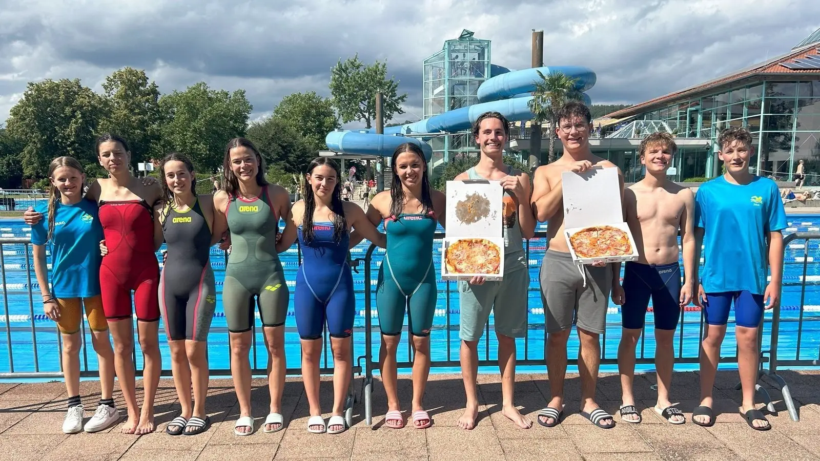 Die Schwimmer des SV Hengersberg beim Adolf-Bohn-Nachwuchs-Schwimmfest mit Trainer Valentin Simbeck (l.) und 2. Vorsitzender Veronika Richter (r).