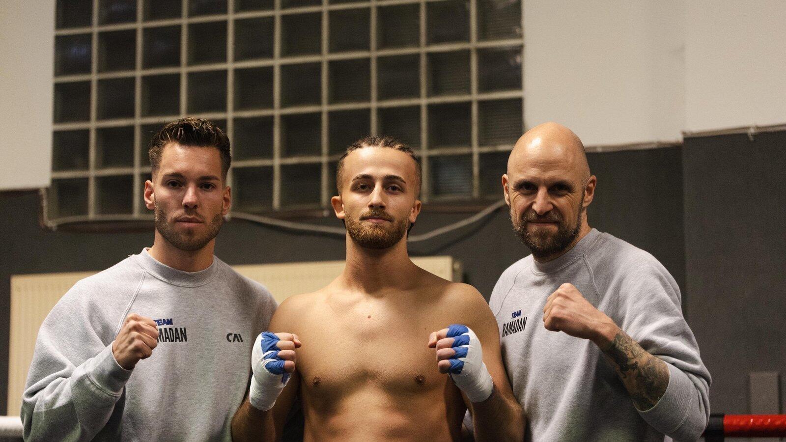 Schlagkräftiger Einstand: Yunes Ramadan (Mitte) ist stolz auf seinen Premierenerfolg - genauso wie sein Trainer Martin Faltermeier (rechts) und Geschäftspartner Daniel Tomaschko.
