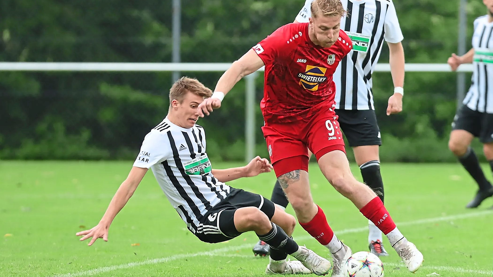 NICHT ZU HALTEN: Traunsteins Sturmtank Kurt Weixler (re.) ließ der Neufraunhofen-Abwehr um Tobias Bitzer (li.) am Sonntag nicht den Hauch einer Chance und netzte dreifach ein.