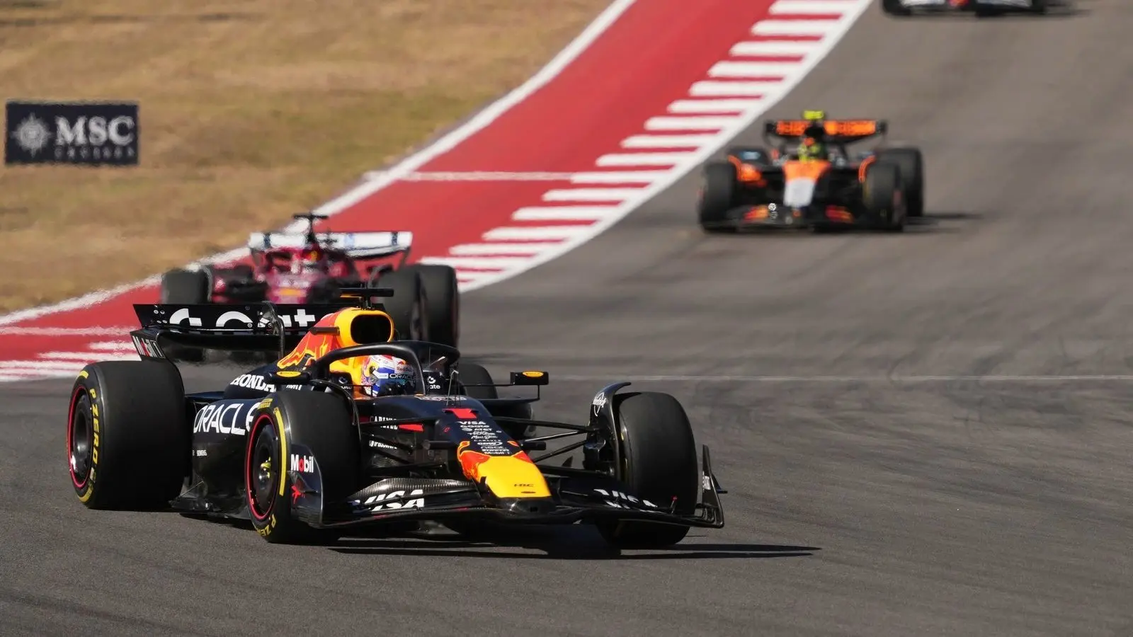 Er sackte neben der riesigen silbernen Longhorn-Trophäe in Anlehnung an die berühmten texanischen Rinder für seinen 68. Karrieresieg auch noch die maximale Punktzahl ein. Fünf Grand Prix vor dem Saisonende erhöhte er so den Druck auf den schwächelnden WM-Spitzenreiter Oscar Piastri und dessen McLaren-Kollegen Lando Norris drastisch. „Die Chance ist sicherlich da, wir müssen nun bis zum Schluss Wochenenden wie dieses hinlegen“, sagte Verstappen zu seinen Chancen auf den fünften WM-Titel in Serie.