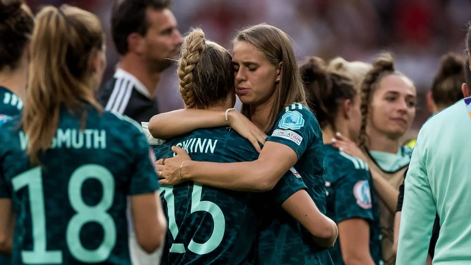 "Das müssen wir erstmal sacken lassen. Wir sind trotzdem froh und stolz, dass wir so viele Menschen erreicht haben", sagte die Wolfsburgerin Huth. "Ich finde einfach, dass wir als Mannschaft unfassbar gut funktioniert haben", sagte Voss-Tecklenburg. Die 54-Jährige war zwar als Spielerin viermal Europameisterin, aber als Trainerin verpasste sie ihren ersten Titel mit den DFB-Frauen.