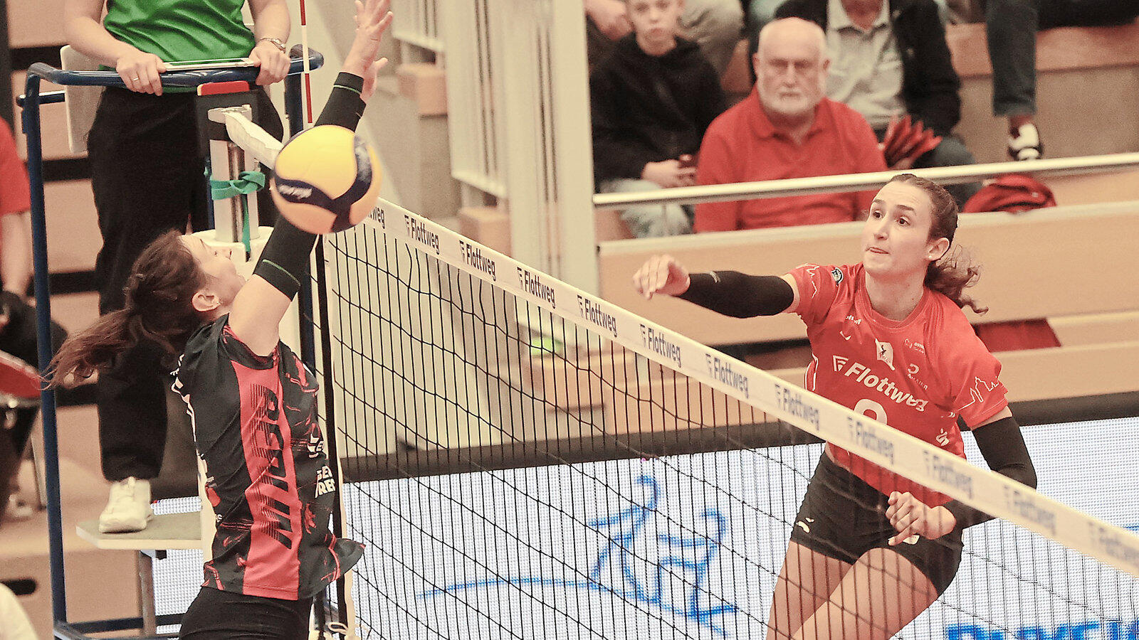 Kein echtes Hindernis: Die Roten Raben hauten den Berlinerinnen die Bälle regelmäßig um die Ohren. In dieser Szene wuchtet Julia Brandhuber (rechts) den Ball am Einerblock der Gäste vorbei.