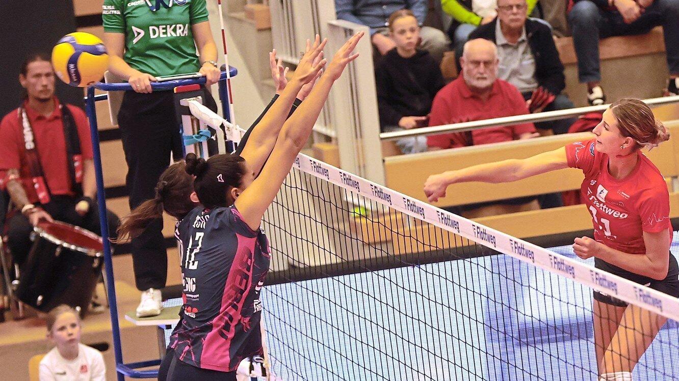 Viel Potenzial: Alayna Crabtree (re.) hat bei ihrem ersten Pflichtspiel in der Ballsporthalle gegen Berlin gleich den „Hammer“ rausgeholt. Die 1,84 Meter große Außenangreiferin verbuchte mit 16 Punkten die meisten Raben-Zähler. So darf das US-Girl in Stralsund gerne weitermachen.