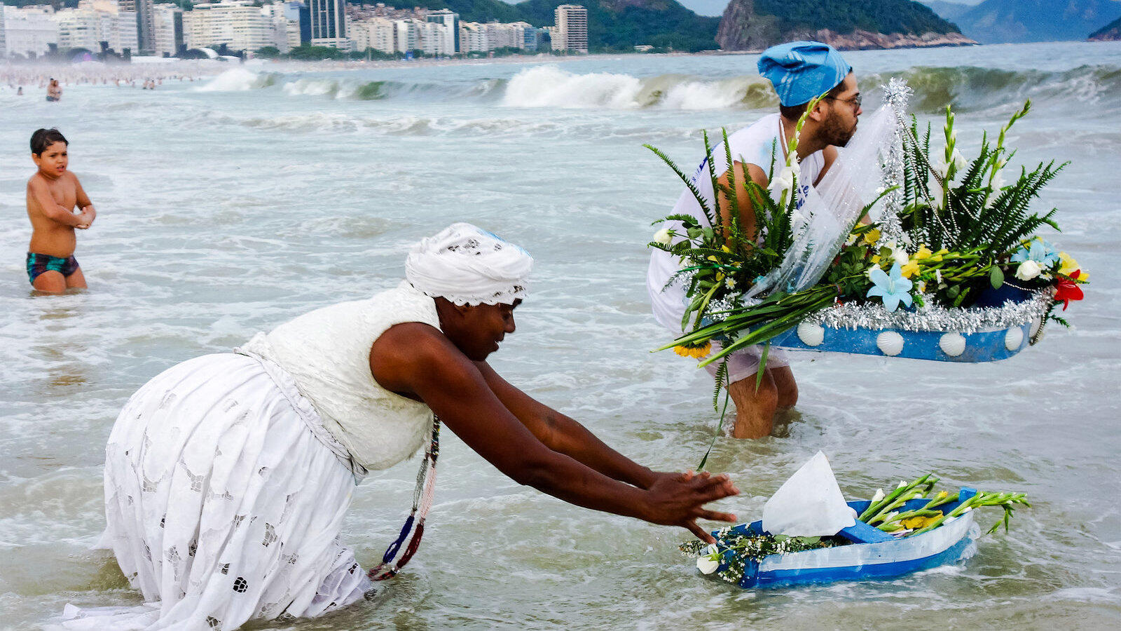Der Apoador Beach in Rio de Janeiro ist voller Menschen: Viele tragen weiße Kleider, Röcke oder Hosen, haben Blumen in der Hand oder schmücken kleine Boote mit ihnen, die dann ins Wasser gesetzt werden.