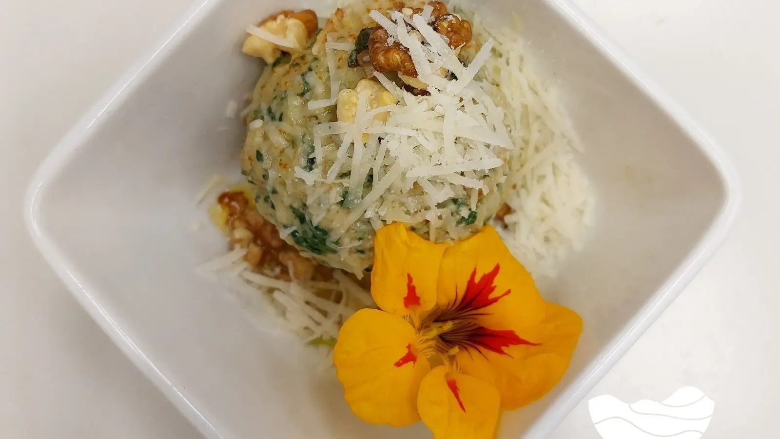 - Knödel mit brauner Salbei-Walnuss-Butter, gehobeltem Parmesan sowie den restlichen Salbeiblättern anrichten und servieren.