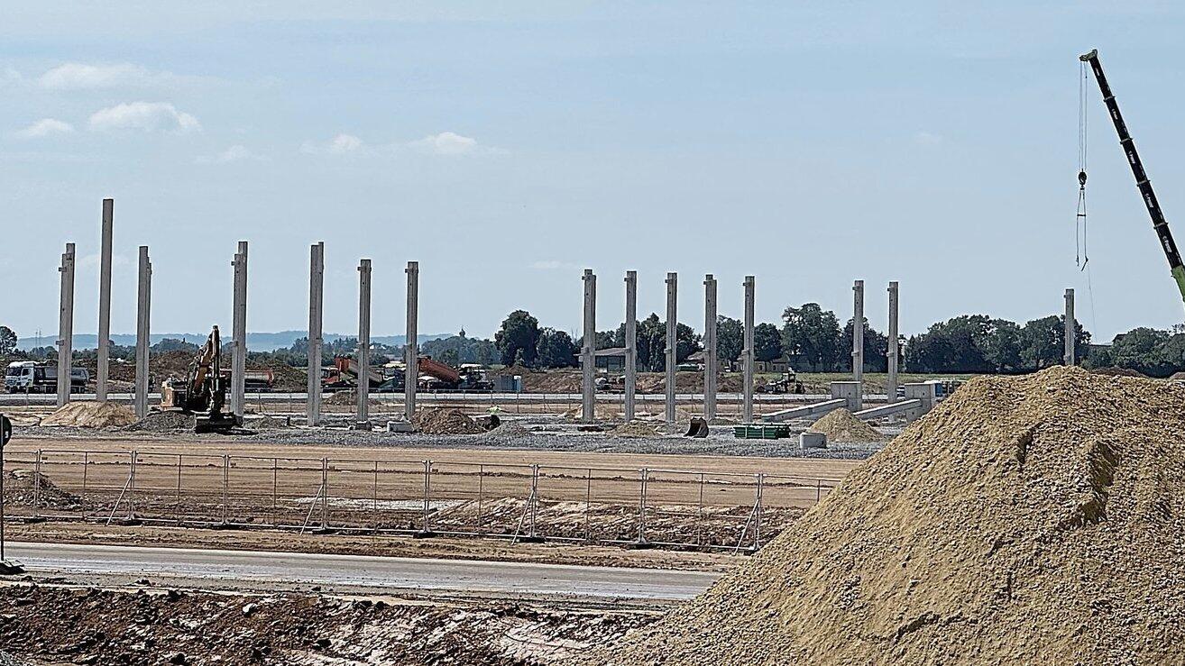 Insgesamt wird die Fertigungshalle des neuen BMW-Batteriemontagewerks in Straßkirchen/Irlbach (Kreis Straubing-Bogen) aus 1.066 Stützen bestehen: Am Montag haben die Arbeiter die erste gestellt, wie es im Fachjargon