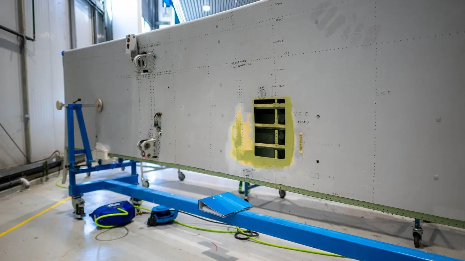 Der Reifen ist geplatzt, die Landeklappe verbeult und Korrosion hat auch schon Spuren hinterlassen. „Das ist eine relativ komplexe Reparatur“, sagt Christopher Jacob, Leiter des Airbus Repair Centers. „Wir müssen die Landeklappe komplett zerlegen.“ Doch wenn die Arbeiten abgeschlossen sind, wird die Klappe wieder wie neu sein.