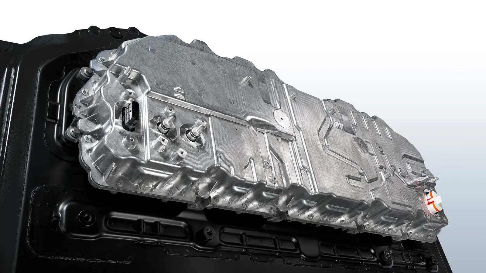 Links ist eine Hochvoltbatterie der sechsten Generation zu sehen, auf der oben der Energy Master montiert ist. Auf der rechten Seite steht eine Hochvoltbatterie der Vorgängergeneration.