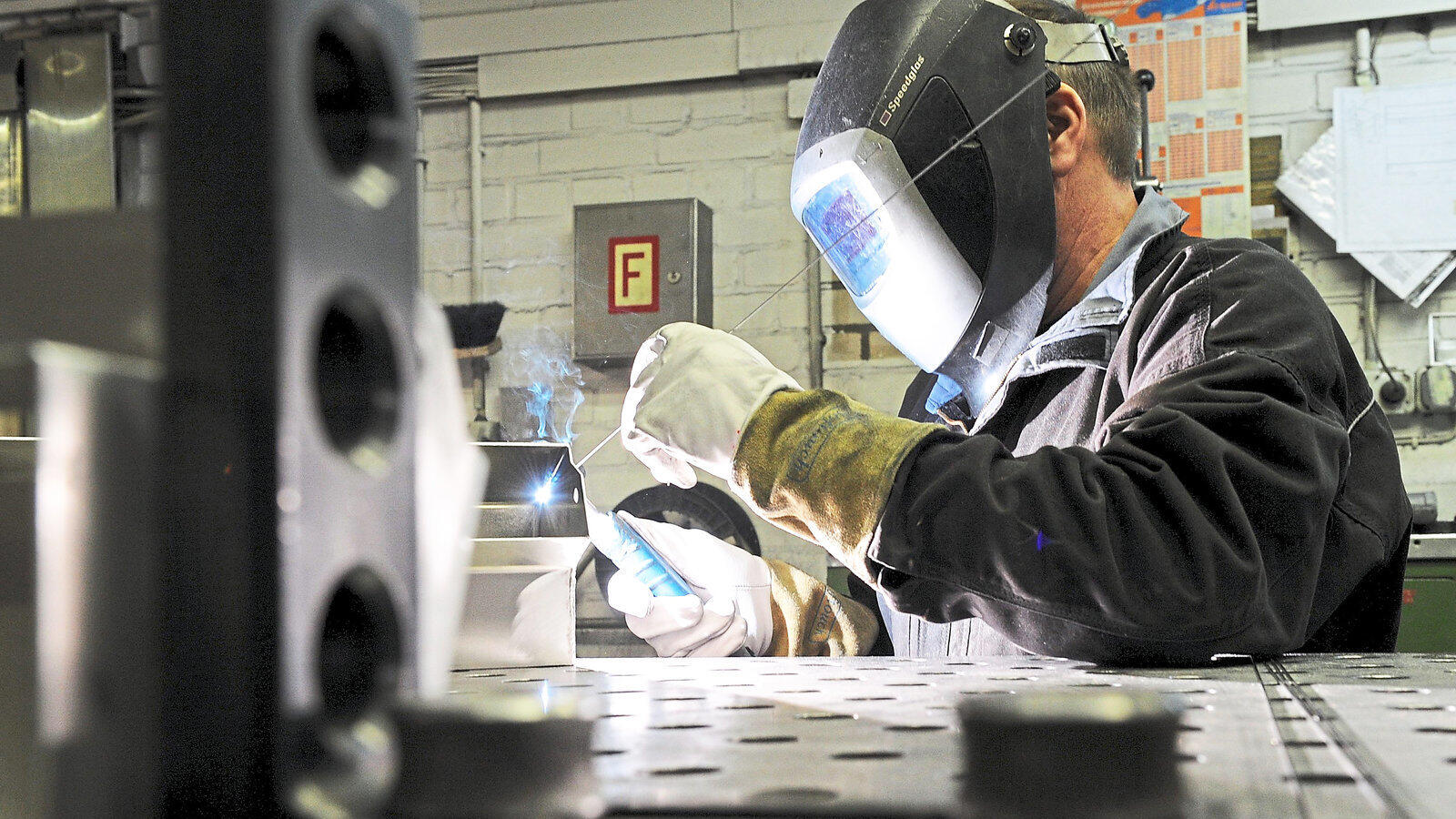 Ein Mitarbeiter eines metallverarbeitenden Betriebs schweißt an einem Werkstück. Die Stimmung in der Branche ist stark eingetrübt.
