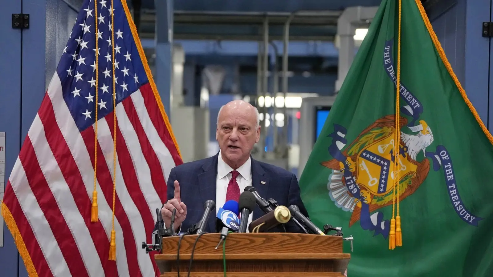 US-Schatzmeister Brandon Beach hält einen der letzten in der US-Münzanstalt in Philadelphia gepressten Pennys in die Kamera.